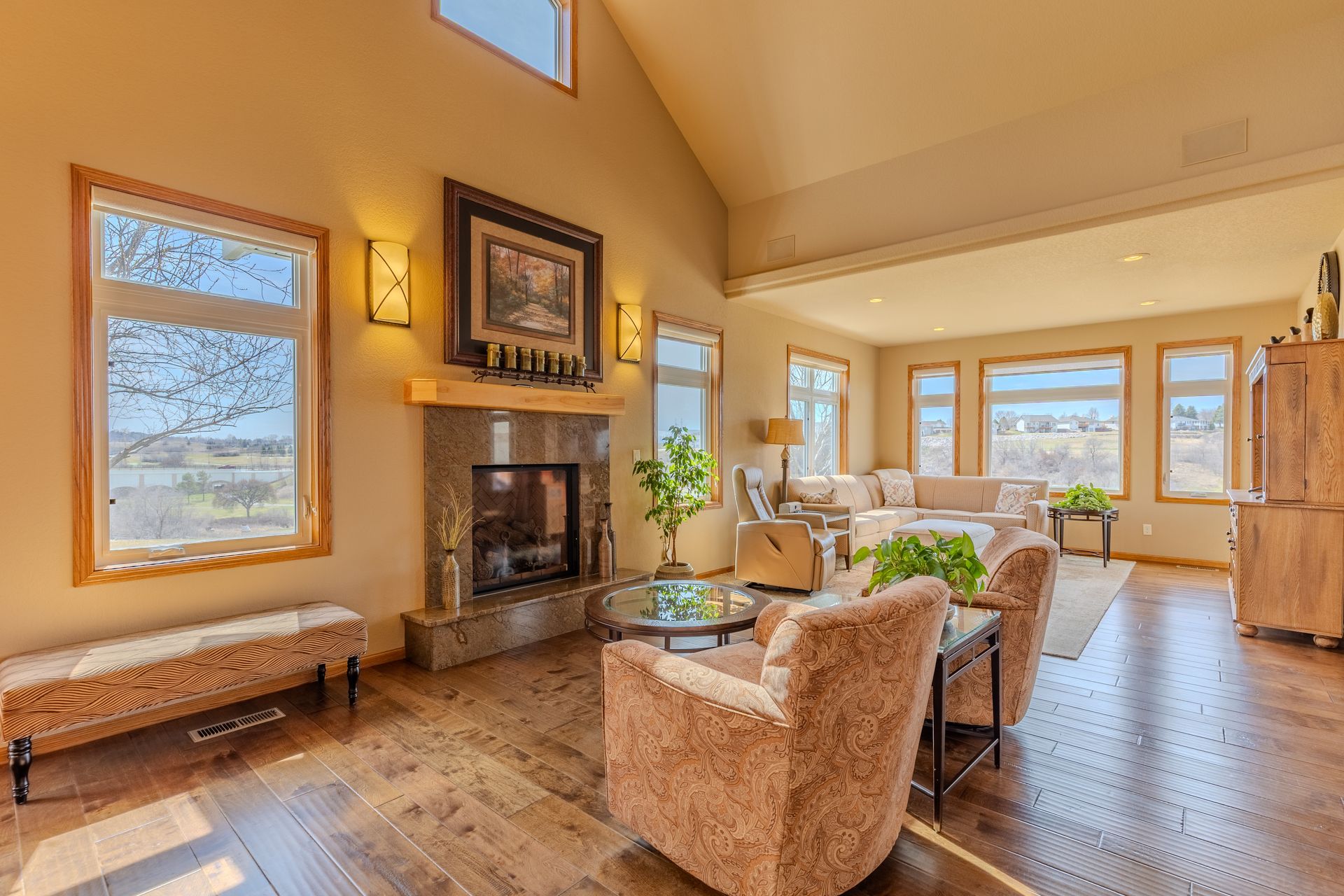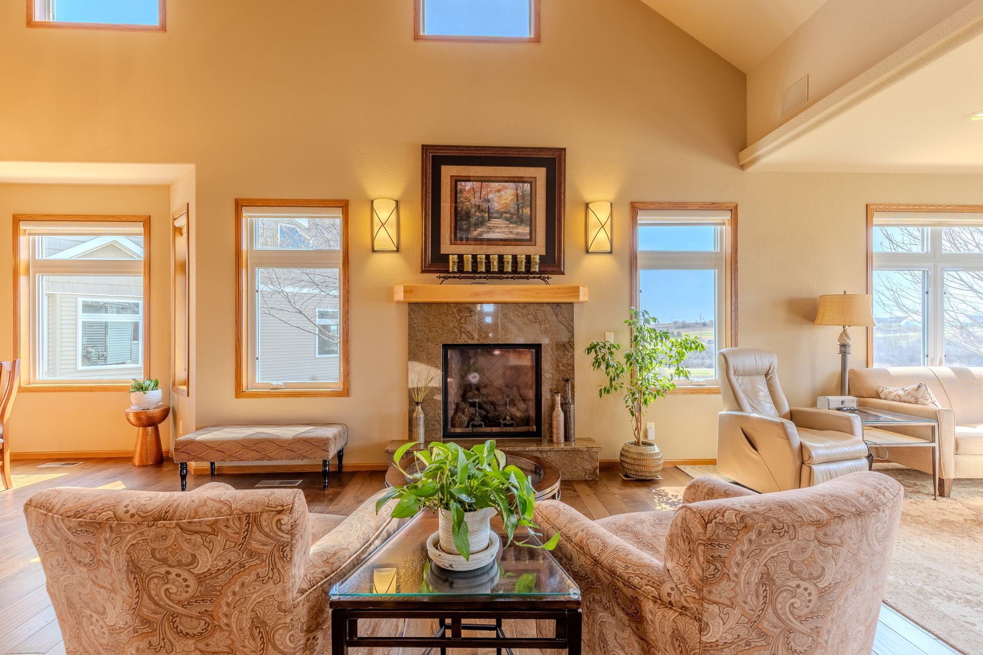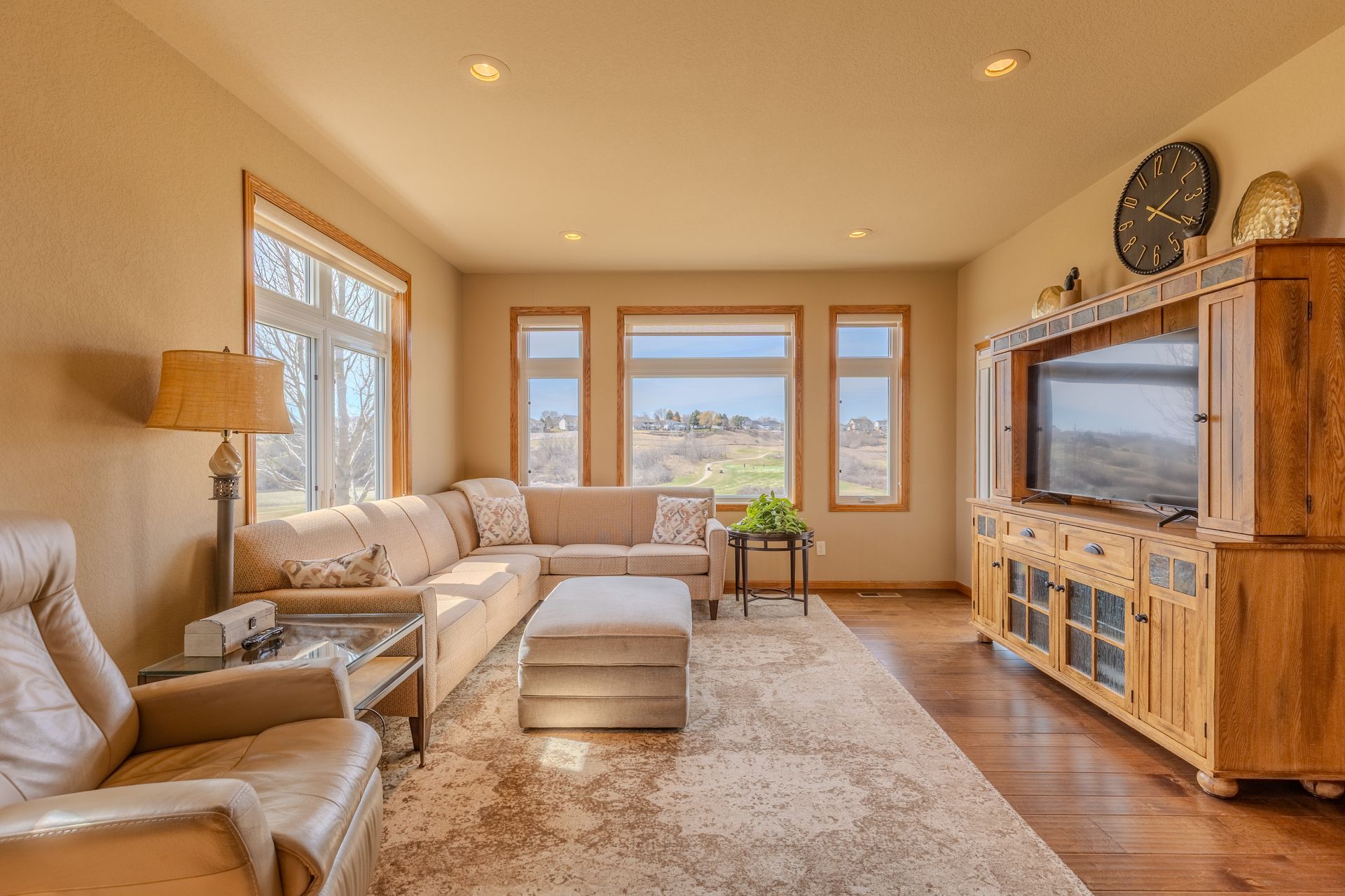 Enjoy abundant natural light and scenic golf course views in this 4 bedroom, 3 bath home offering no step entry into the main level. The open concept layout begins with a front facing kitchen featuring granite countertops, stainless steel appliances, and cabinetry with pull-out drawers. The adjoining dining area flows effortlessly into the living room area with a gas fireplace, as well as a sunroom positioned to take in the golf course views. The main floor primary suite includes a walk-in closet and a private bath with dual sinks, jetted tub, and tiled shower. A second bedroom currently used as an office along with a half bath and main floor laundry complete this level. Upstairs, the loft provides a sitting area, 2 additional bedrooms, a full bathroom, and storage space. The attached, heated and insulated 2-stall garage offers hot and cold water, plus a floor drain. HOA services take care of lawn care and snow removal