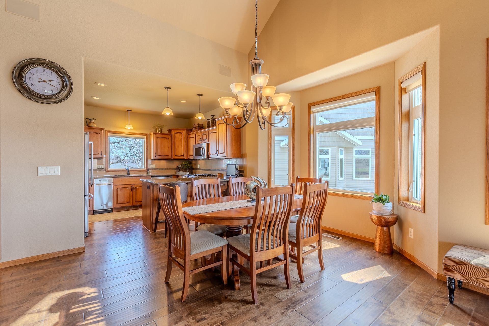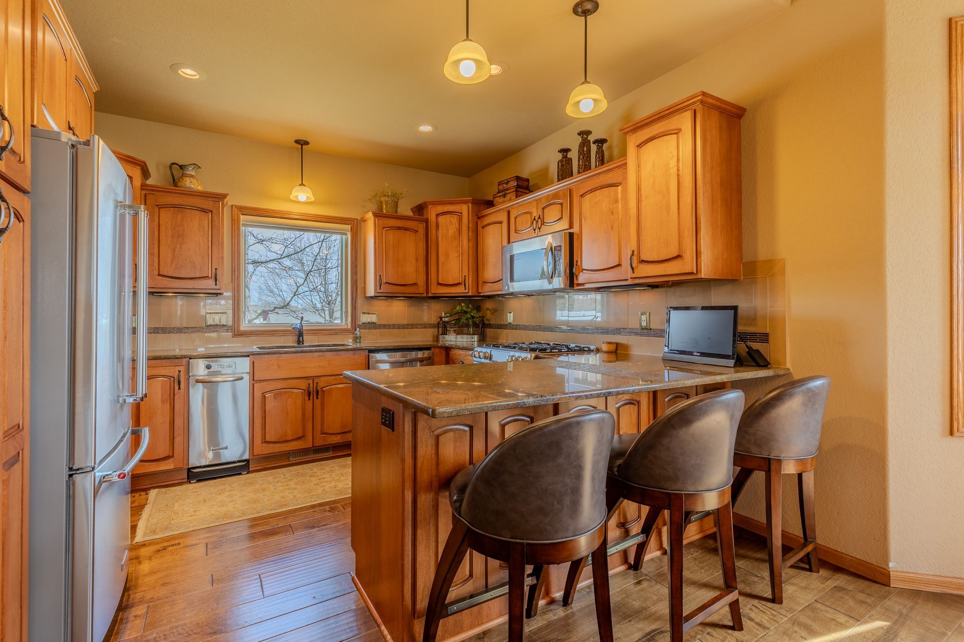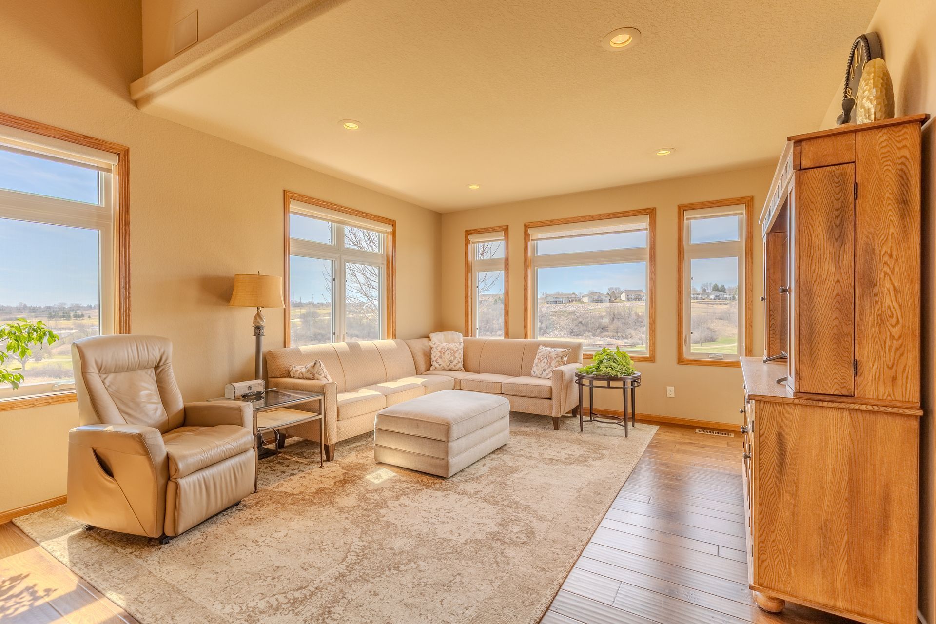 Enjoy abundant natural light and scenic golf course views in this 4 bedroom, 3 bath home offering no step entry into the main level. The open concept layout begins with a front facing kitchen featuring granite countertops, stainless steel appliances, and cabinetry with pull-out drawers. The adjoining dining area flows effortlessly into the living room area with a gas fireplace, as well as a sunroom positioned to take in the golf course views. The main floor primary suite includes a walk-in closet and a private bath with dual sinks, jetted tub, and tiled shower. A second bedroom currently used as an office along with a half bath and main floor laundry complete this level. Upstairs, the loft provides a sitting area, 2 additional bedrooms, a full bathroom, and storage space. The attached, heated and insulated 2-stall garage offers hot and cold water, plus a floor drain. HOA services take care of lawn care and snow removal