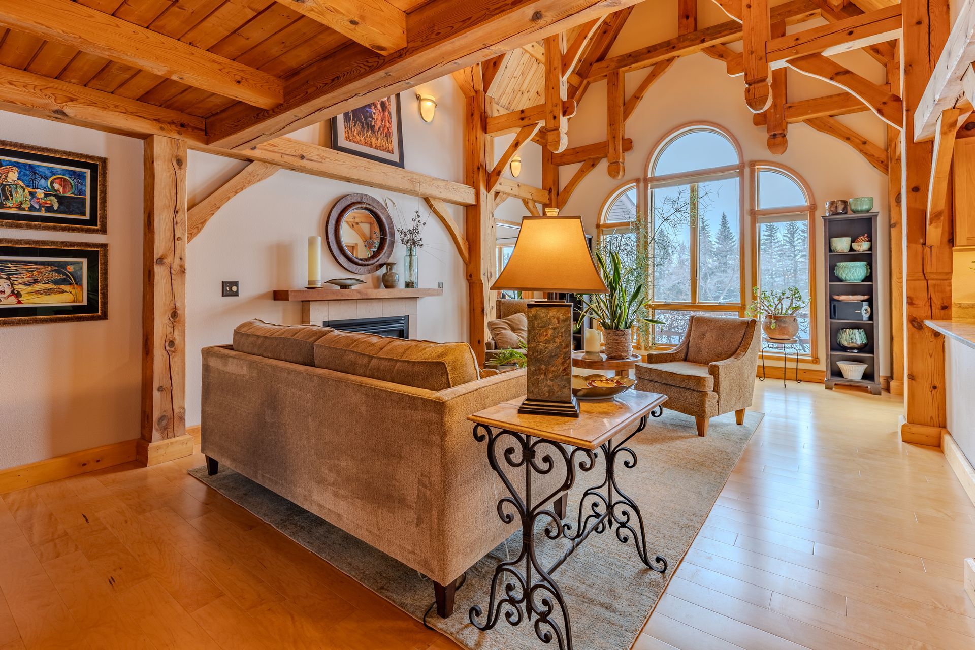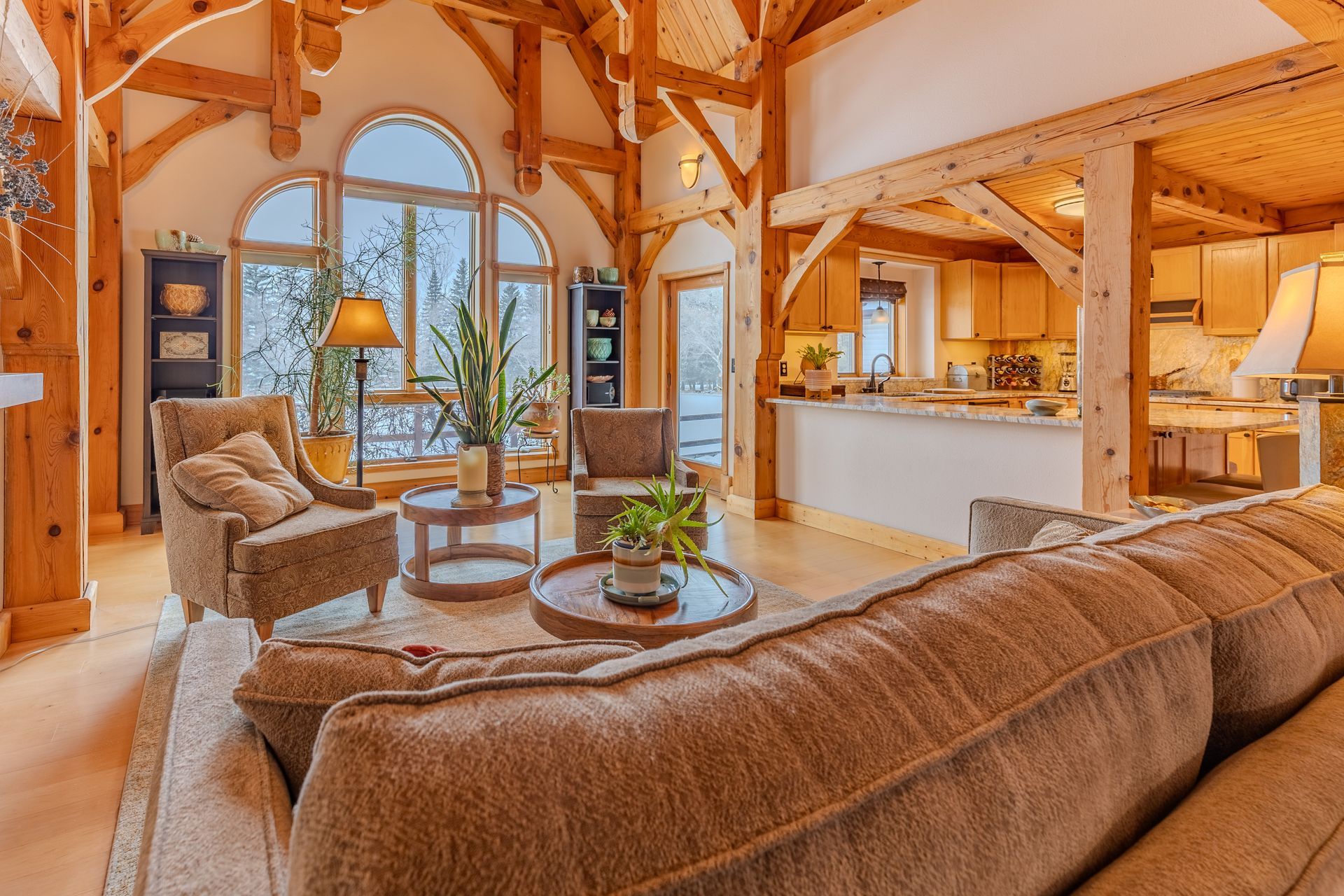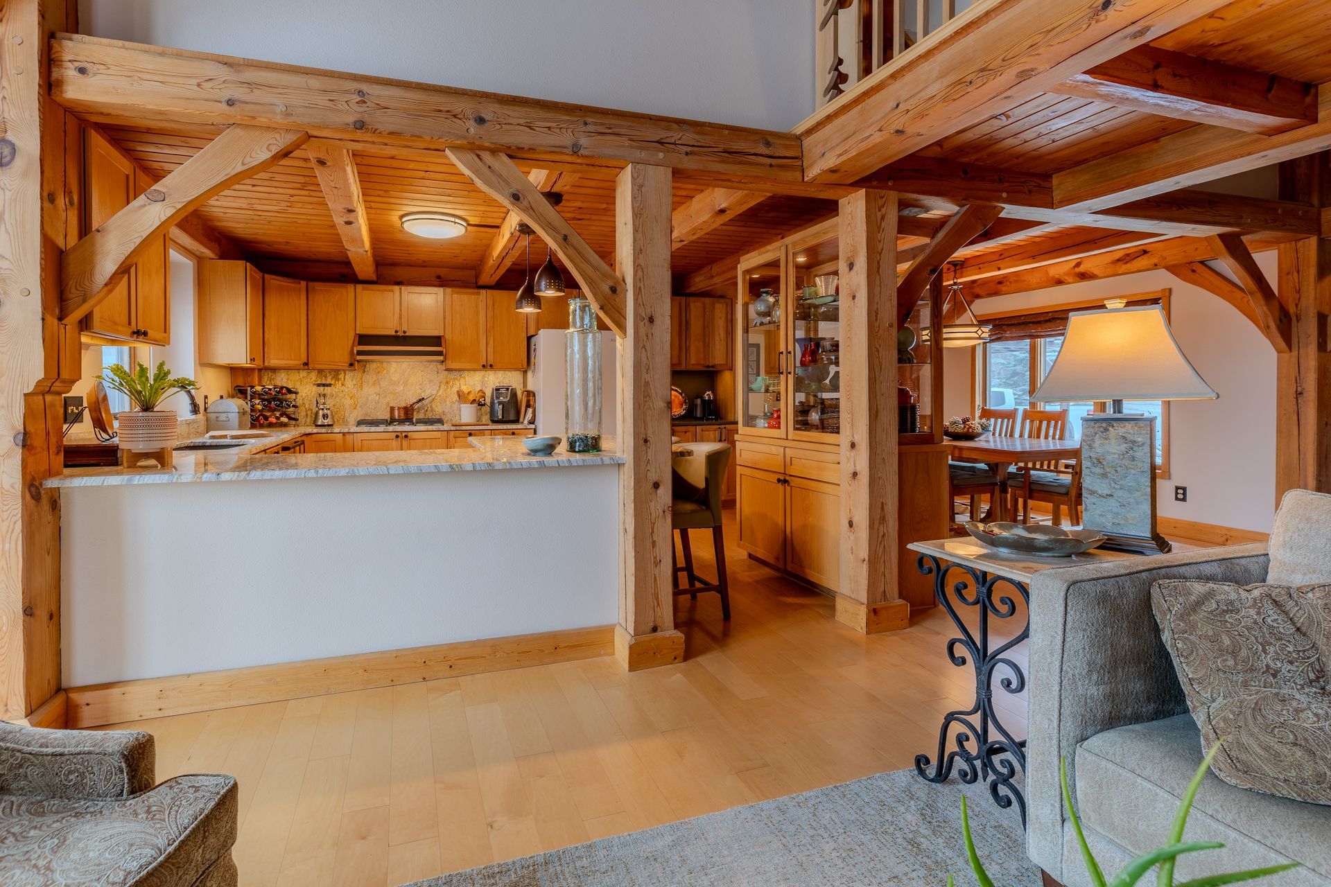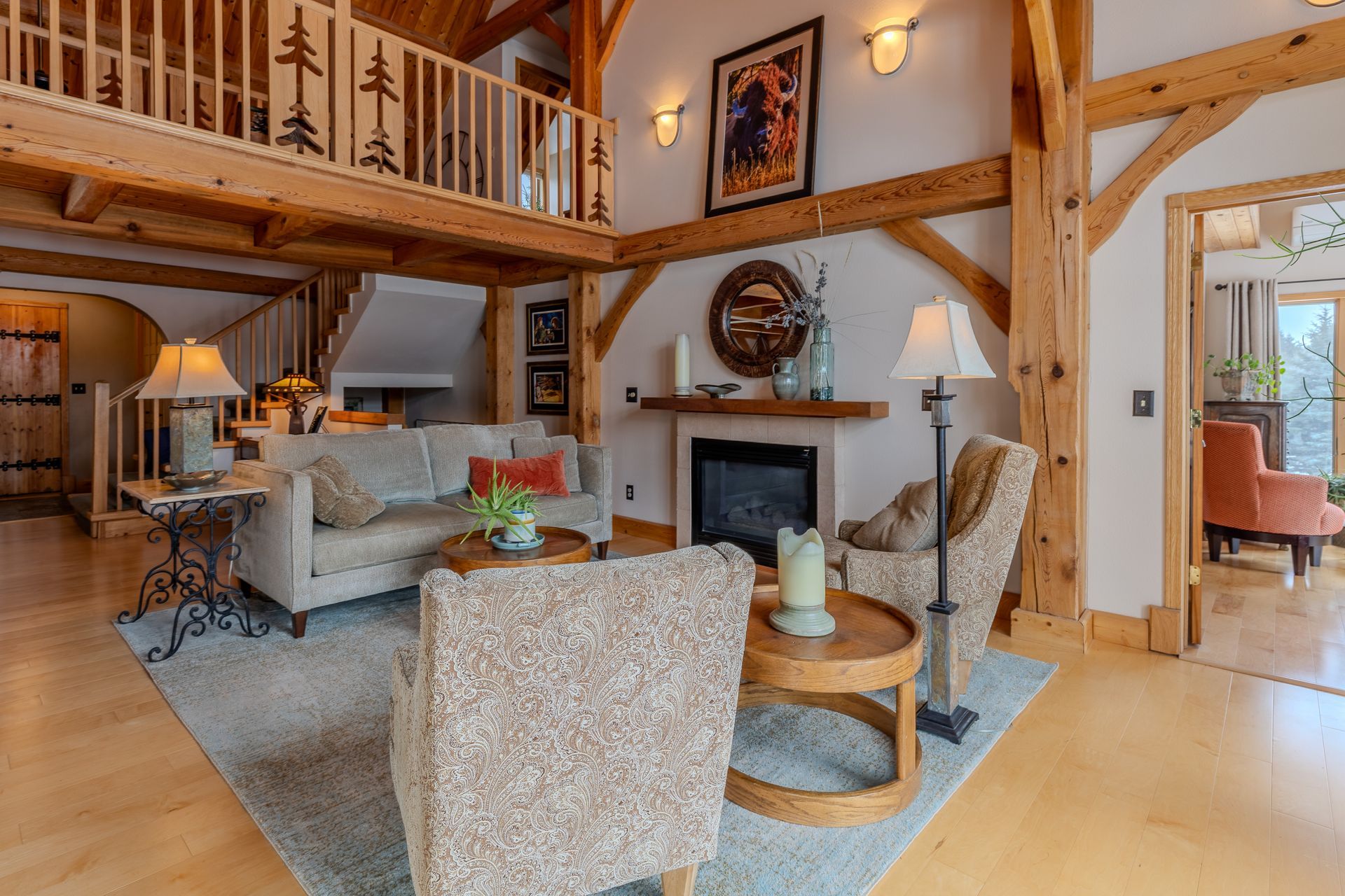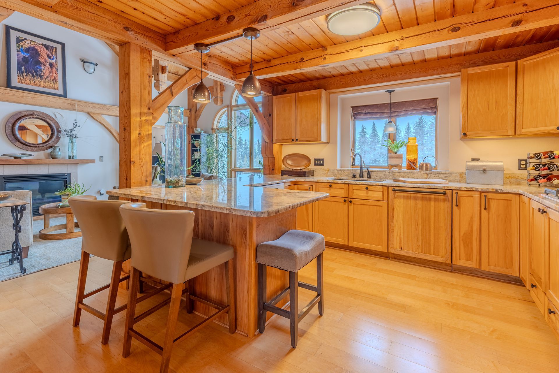 Situated on nearly 3 acres and surrounded by mature trees, this custom-built Scandinavian-inspired home is rich in character and charm. Enter through the rustic front door into a light-filled living room featuring expansive windows that showcase exposed timber beams, a gas fireplace, and hardwood flooring that flows seamlessly into the dining area and kitchen. The kitchen offers granite countertops, hickory cabinetry, a built-in china hutch, and a gas cooktop. The primary suite is a private retreat, complete with an adjacent cozy sunroom. The primary bathroom includes dual sinks, a curbless custom tiled shower with bench, and access to an additional walk-in closet. A convenient half bath and laundry area are located on the main level, providing access to the attached garage. The upper level features a guest bedroom near a ¾ bathroom, along with a catwalk leading to a versatile loft—ideal for a family room, office, or den. The finished basement includes two additional bedrooms, a full bathroom, and a spacious family room perfect for entertaining, complete with a TV area, kitchenette, and a sit-at bar with included pool table. The attached two-stall garage offers a heated bonus room, with additional space available for a future shop on the large lot. Enjoy the serene outdoor setting from the front patio with pergola, rear deck, or fire pit, all surrounded by beautiful blue spruce trees. Buyer to verify all property information.