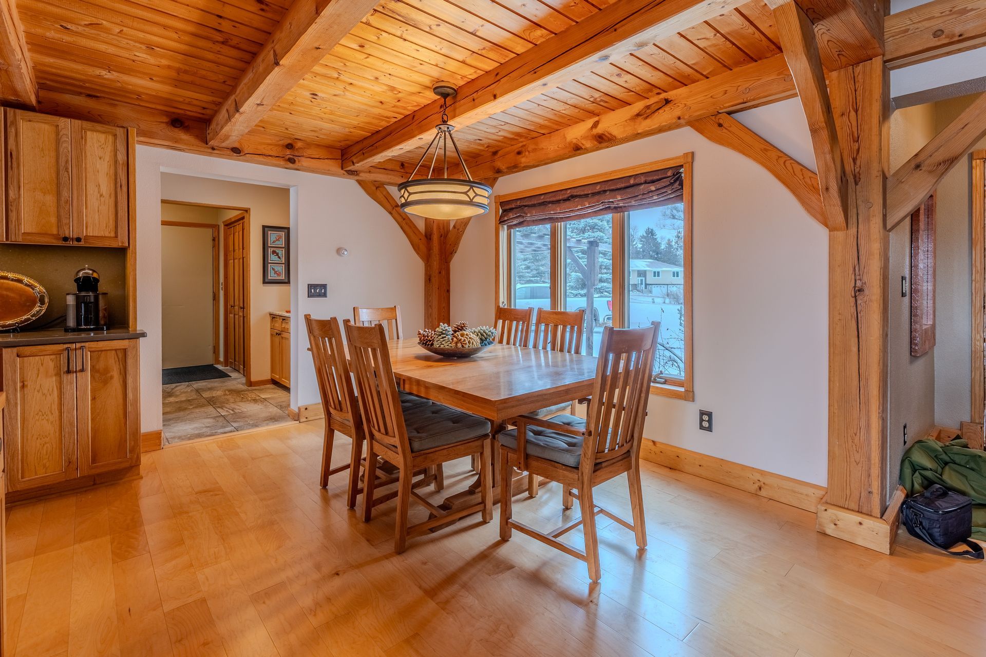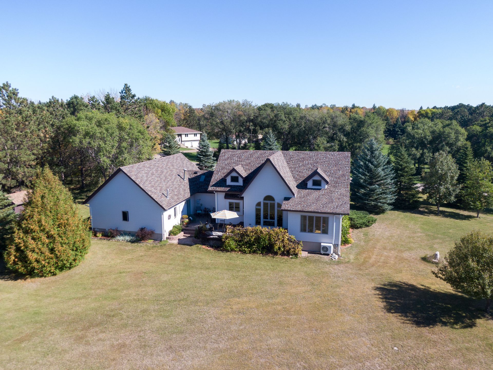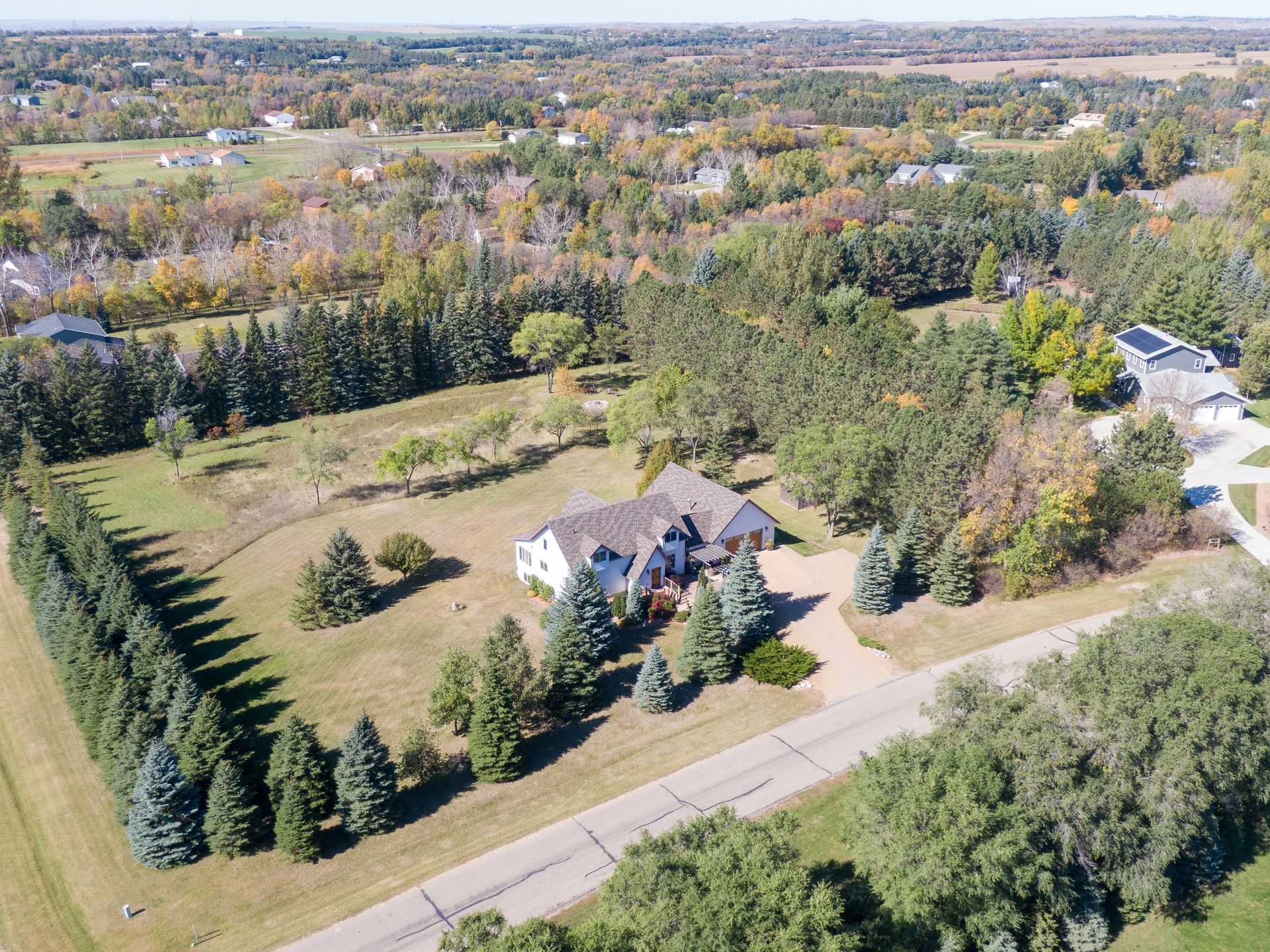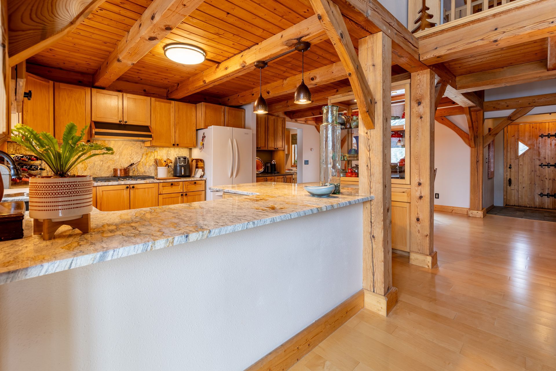 Situated on nearly 3 acres and surrounded by mature trees, this custom-built Scandinavian-inspired home is rich in character and charm. Enter through the rustic front door into a light-filled living room featuring expansive windows that showcase exposed timber beams, a gas fireplace, and hardwood flooring that flows seamlessly into the dining area and kitchen. The kitchen offers granite countertops, hickory cabinetry, a built-in china hutch, and a gas cooktop. The primary suite is a private retreat, complete with an adjacent cozy sunroom. The primary bathroom includes dual sinks, a curbless custom tiled shower with bench, and access to an additional walk-in closet. A convenient half bath and laundry area are located on the main level, providing access to the attached garage. The upper level features a guest bedroom near a ¾ bathroom, along with a catwalk leading to a versatile loft—ideal for a family room, office, or den. The finished basement includes two additional bedrooms, a full bathroom, and a spacious family room perfect for entertaining, complete with a TV area, kitchenette, and a sit-at bar with included pool table. The attached two-stall garage offers a heated bonus room, with additional space available for a future shop on the large lot. Enjoy the serene outdoor setting from the front patio with pergola, rear deck, or fire pit, all surrounded by beautiful blue spruce trees. Buyer to verify all property information.