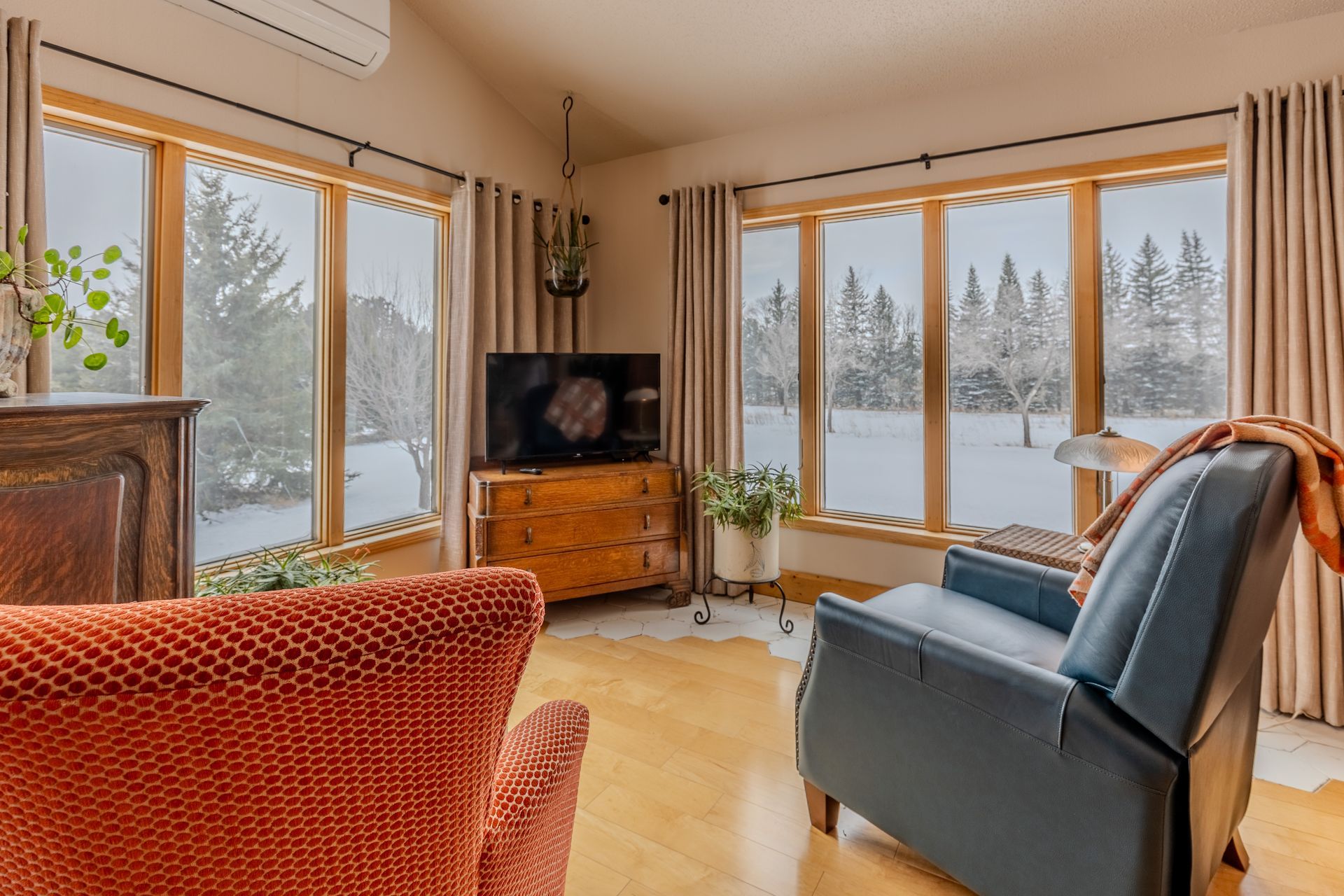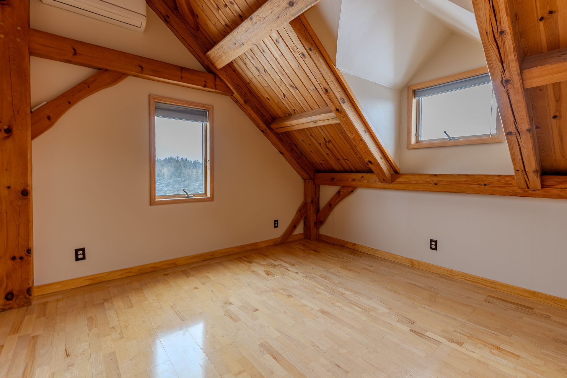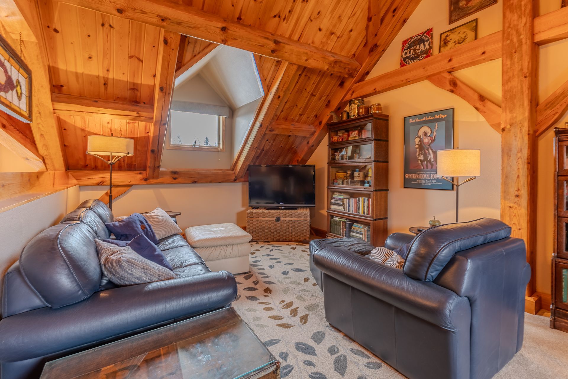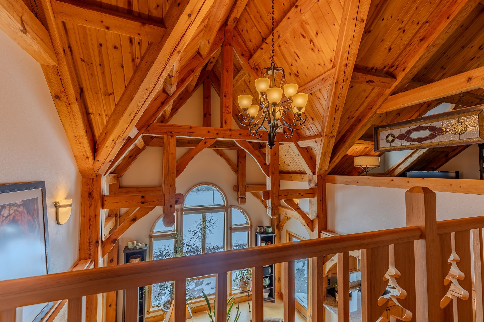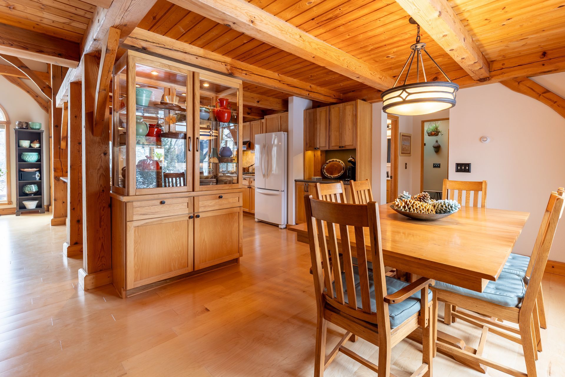 Situated on nearly 3 acres and surrounded by mature trees, this custom-built Scandinavian-inspired home is rich in character and charm. Enter through the rustic front door into a light-filled living room featuring expansive windows that showcase exposed timber beams, a gas fireplace, and hardwood flooring that flows seamlessly into the dining area and kitchen. The kitchen offers granite countertops, hickory cabinetry, a built-in china hutch, and a gas cooktop. The primary suite is a private retreat, complete with an adjacent cozy sunroom. The primary bathroom includes dual sinks, a curbless custom tiled shower with bench, and access to an additional walk-in closet. A convenient half bath and laundry area are located on the main level, providing access to the attached garage. The upper level features a guest bedroom near a ¾ bathroom, along with a catwalk leading to a versatile loft—ideal for a family room, office, or den. The finished basement includes two additional bedrooms, a full bathroom, and a spacious family room perfect for entertaining, complete with a TV area, kitchenette, and a sit-at bar with included pool table. The attached two-stall garage offers a heated bonus room, with additional space available for a future shop on the large lot. Enjoy the serene outdoor setting from the front patio with pergola, rear deck, or fire pit, all surrounded by beautiful blue spruce trees. Buyer to verify all property information.