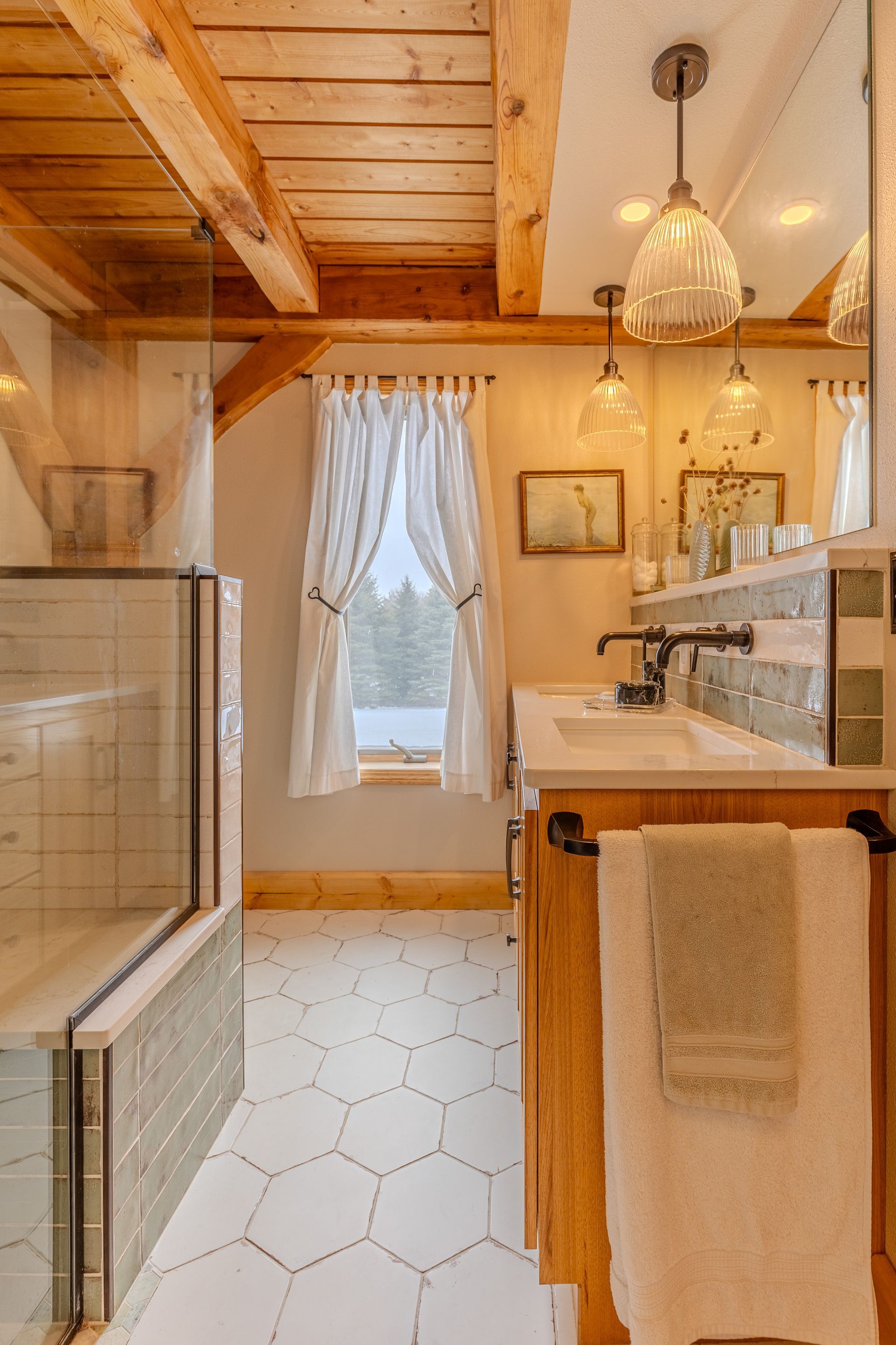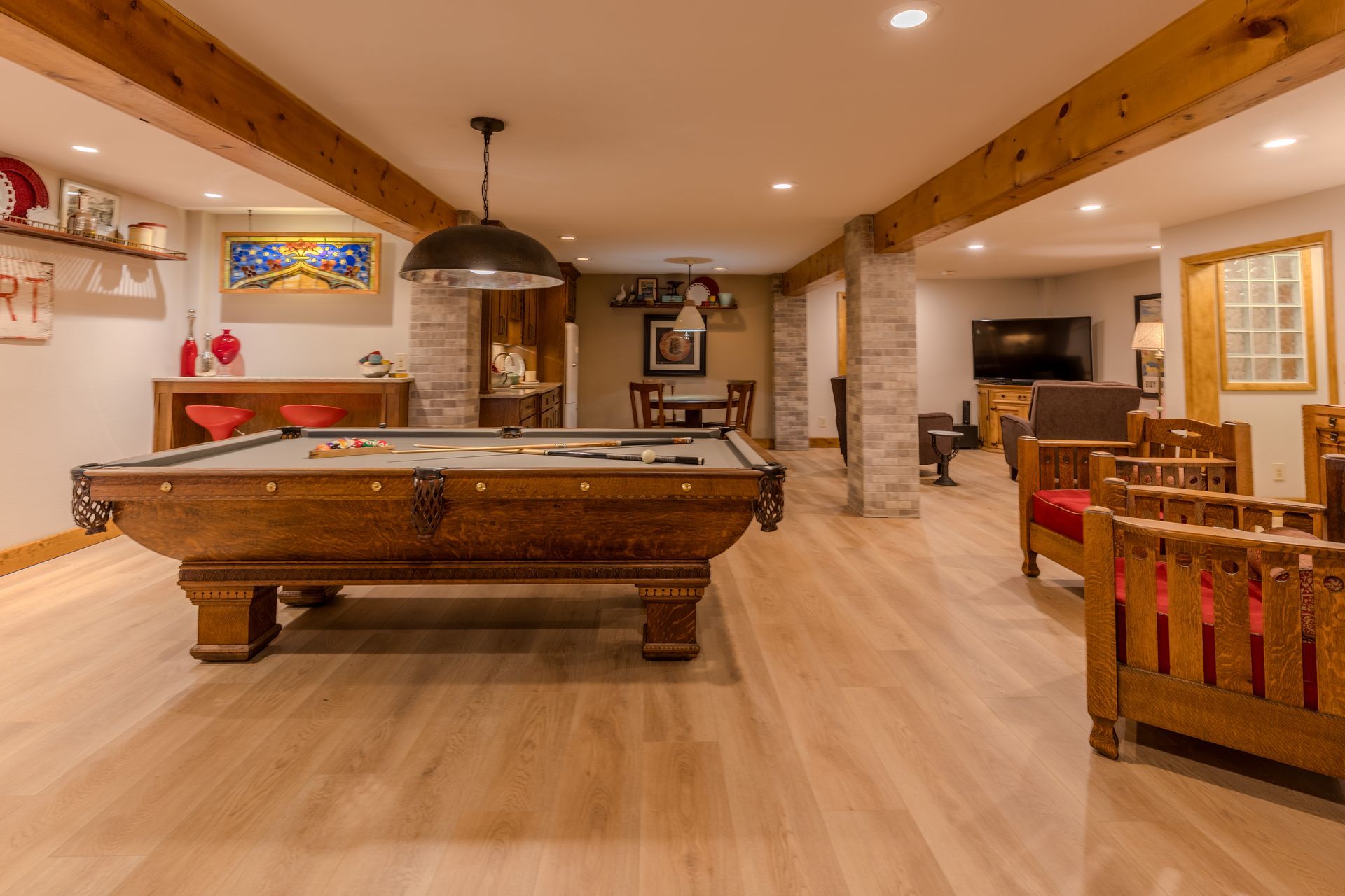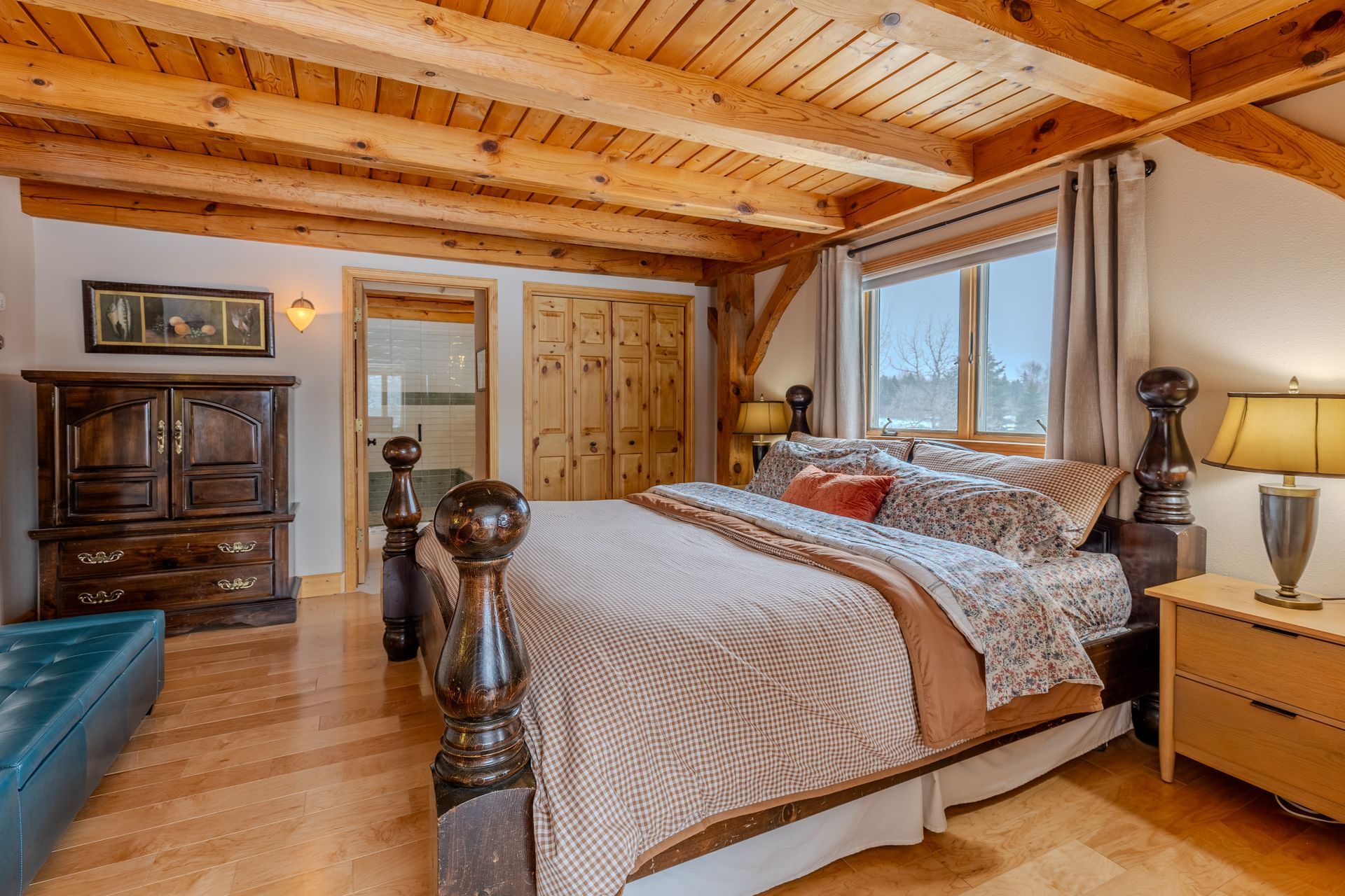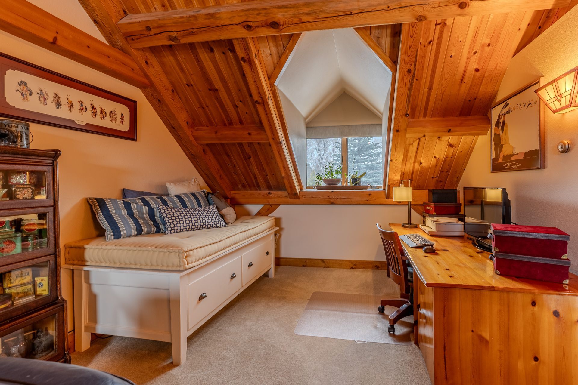 Situated on nearly 3 acres and surrounded by mature trees, this custom-built Scandinavian-inspired home is rich in character and charm. Enter through the rustic front door into a light-filled living room featuring expansive windows that showcase exposed timber beams, a gas fireplace, and hardwood flooring that flows seamlessly into the dining area and kitchen. The kitchen offers granite countertops, hickory cabinetry, a built-in china hutch, and a gas cooktop. The primary suite is a private retreat, complete with an adjacent cozy sunroom. The primary bathroom includes dual sinks, a curbless custom tiled shower with bench, and access to an additional walk-in closet. A convenient half bath and laundry area are located on the main level, providing access to the attached garage. The upper level features a guest bedroom near a ¾ bathroom, along with a catwalk leading to a versatile loft—ideal for a family room, office, or den. The finished basement includes two additional bedrooms, a full bathroom, and a spacious family room perfect for entertaining, complete with a TV area, kitchenette, and a sit-at bar with included pool table. The attached two-stall garage offers a heated bonus room, with additional space available for a future shop on the large lot. Enjoy the serene outdoor setting from the front patio with pergola, rear deck, or fire pit, all surrounded by beautiful blue spruce trees. Buyer to verify all property information.