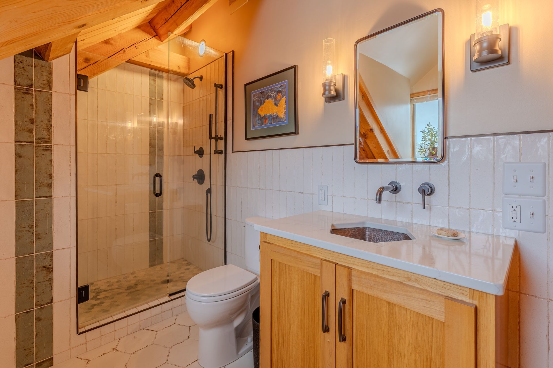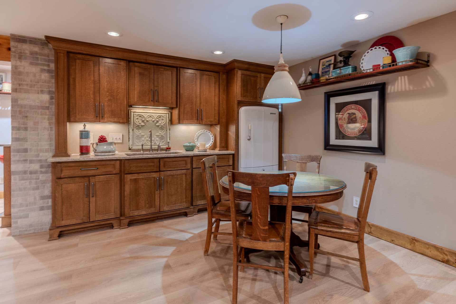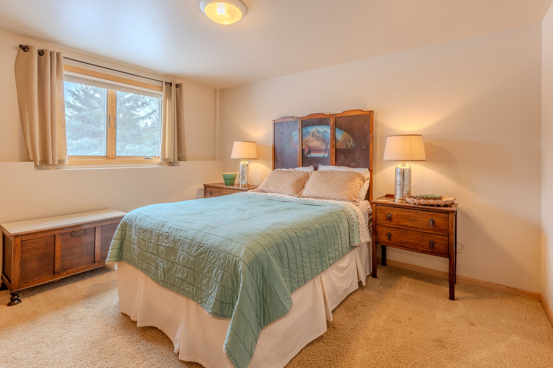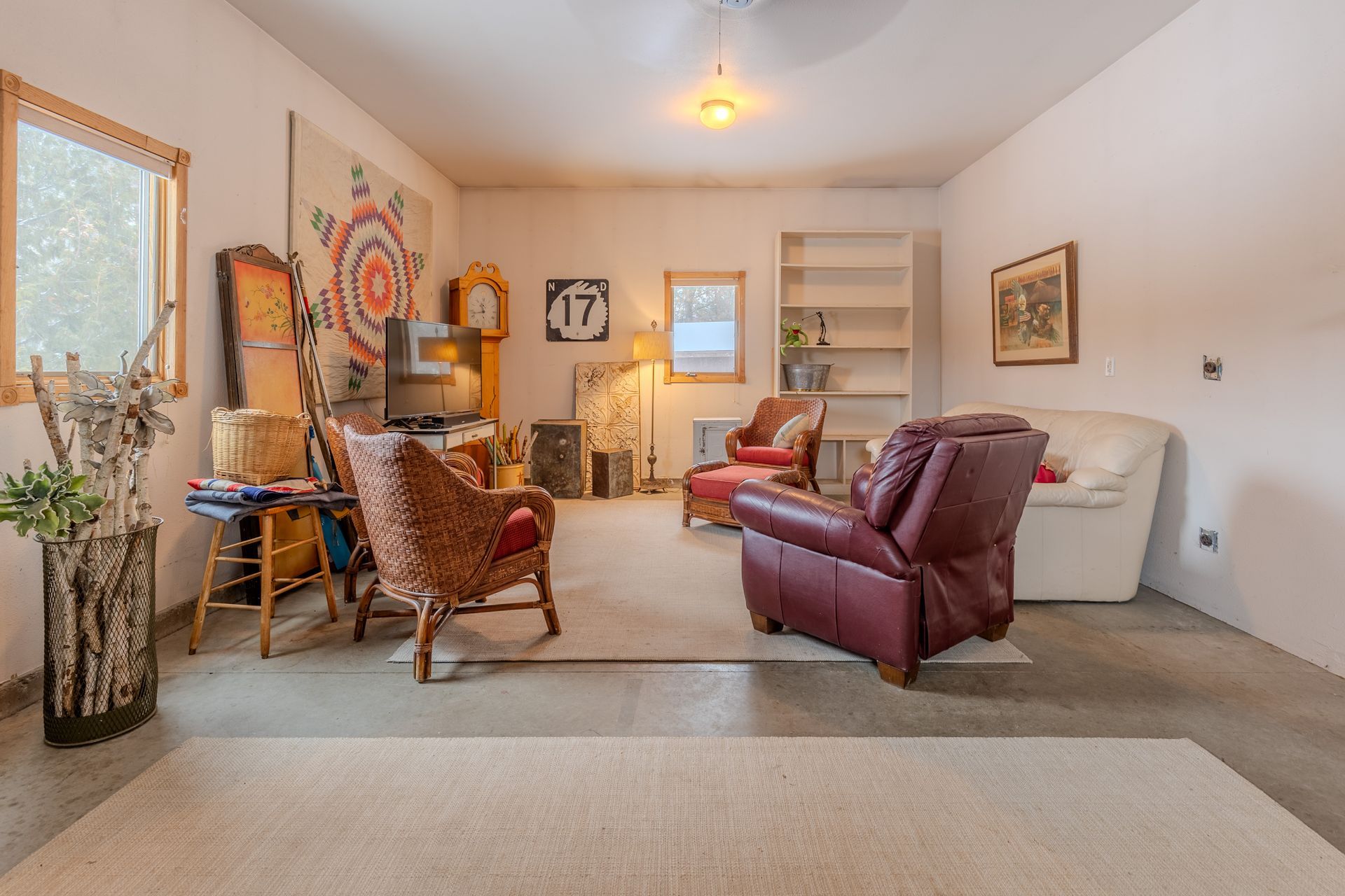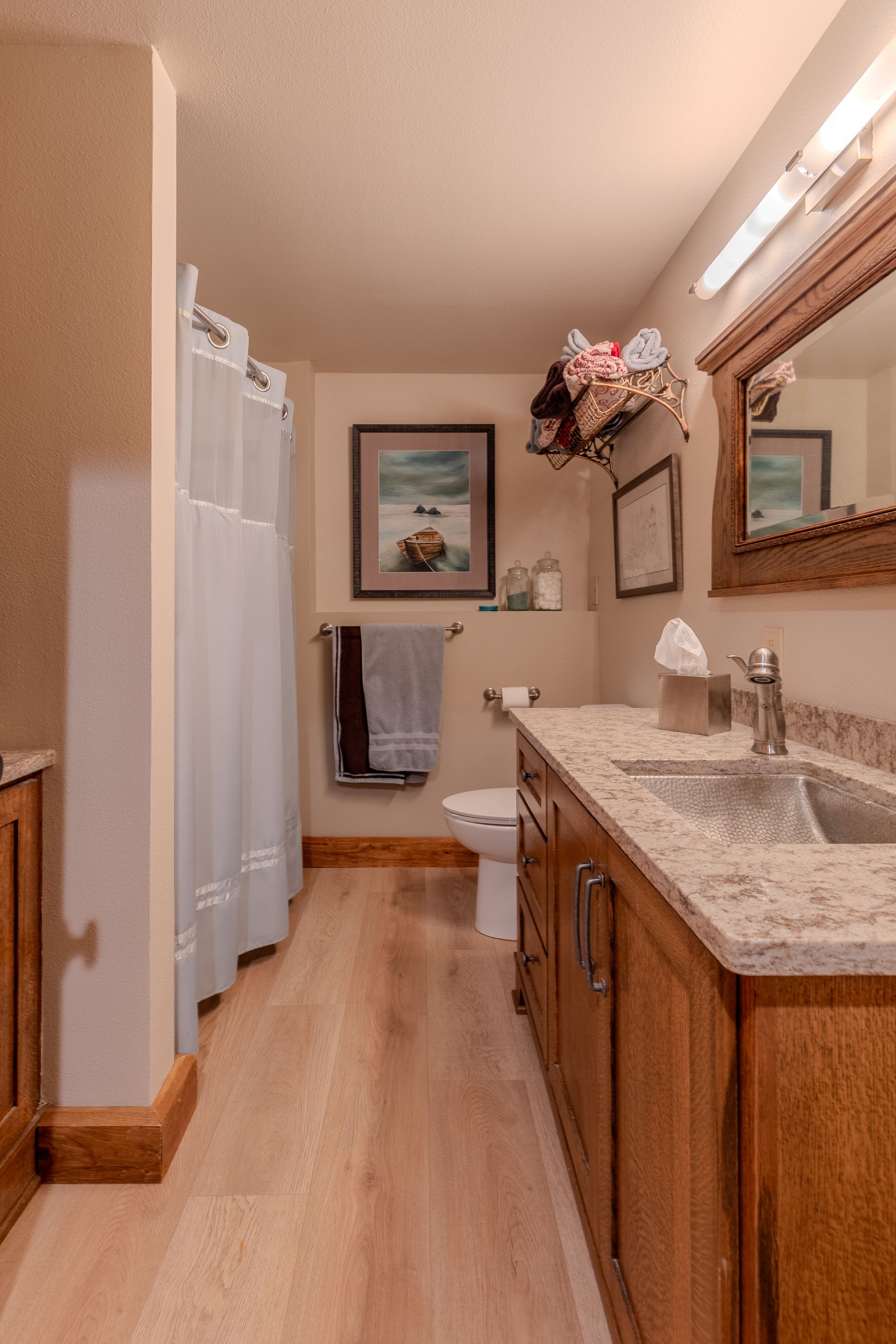 Situated on nearly 3 acres and surrounded by mature trees, this custom-built Scandinavian-inspired home is rich in character and charm. Enter through the rustic front door into a light-filled living room featuring expansive windows that showcase exposed timber beams, a gas fireplace, and hardwood flooring that flows seamlessly into the dining area and kitchen. The kitchen offers granite countertops, hickory cabinetry, a built-in china hutch, and a gas cooktop. The primary suite is a private retreat, complete with an adjacent cozy sunroom. The primary bathroom includes dual sinks, a curbless custom tiled shower with bench, and access to an additional walk-in closet. A convenient half bath and laundry area are located on the main level, providing access to the attached garage. The upper level features a guest bedroom near a ¾ bathroom, along with a catwalk leading to a versatile loft—ideal for a family room, office, or den. The finished basement includes two additional bedrooms, a full bathroom, and a spacious family room perfect for entertaining, complete with a TV area, kitchenette, and a sit-at bar with included pool table. The attached two-stall garage offers a heated bonus room, with additional space available for a future shop on the large lot. Enjoy the serene outdoor setting from the front patio with pergola, rear deck, or fire pit, all surrounded by beautiful blue spruce trees. Buyer to verify all property information.