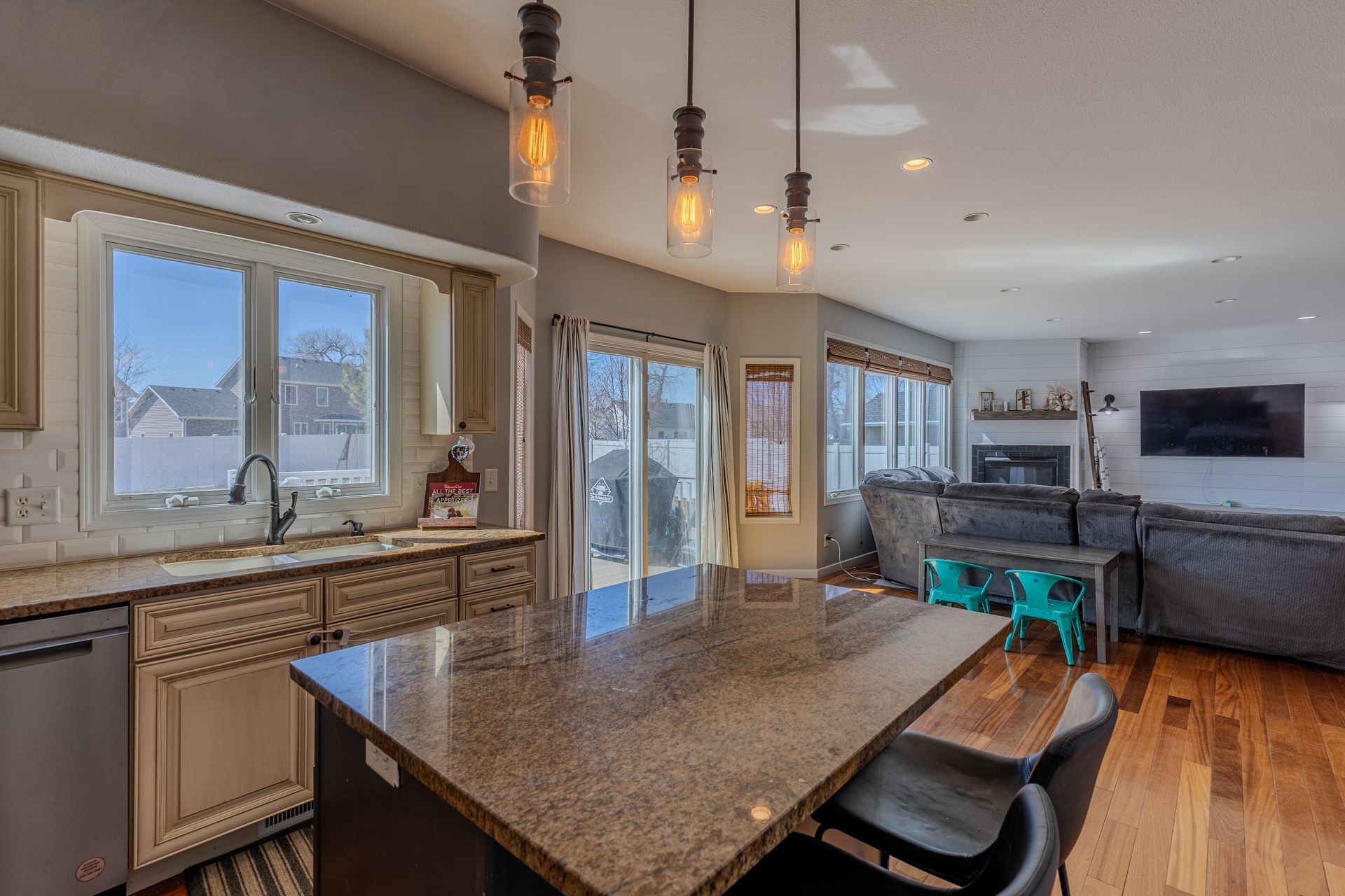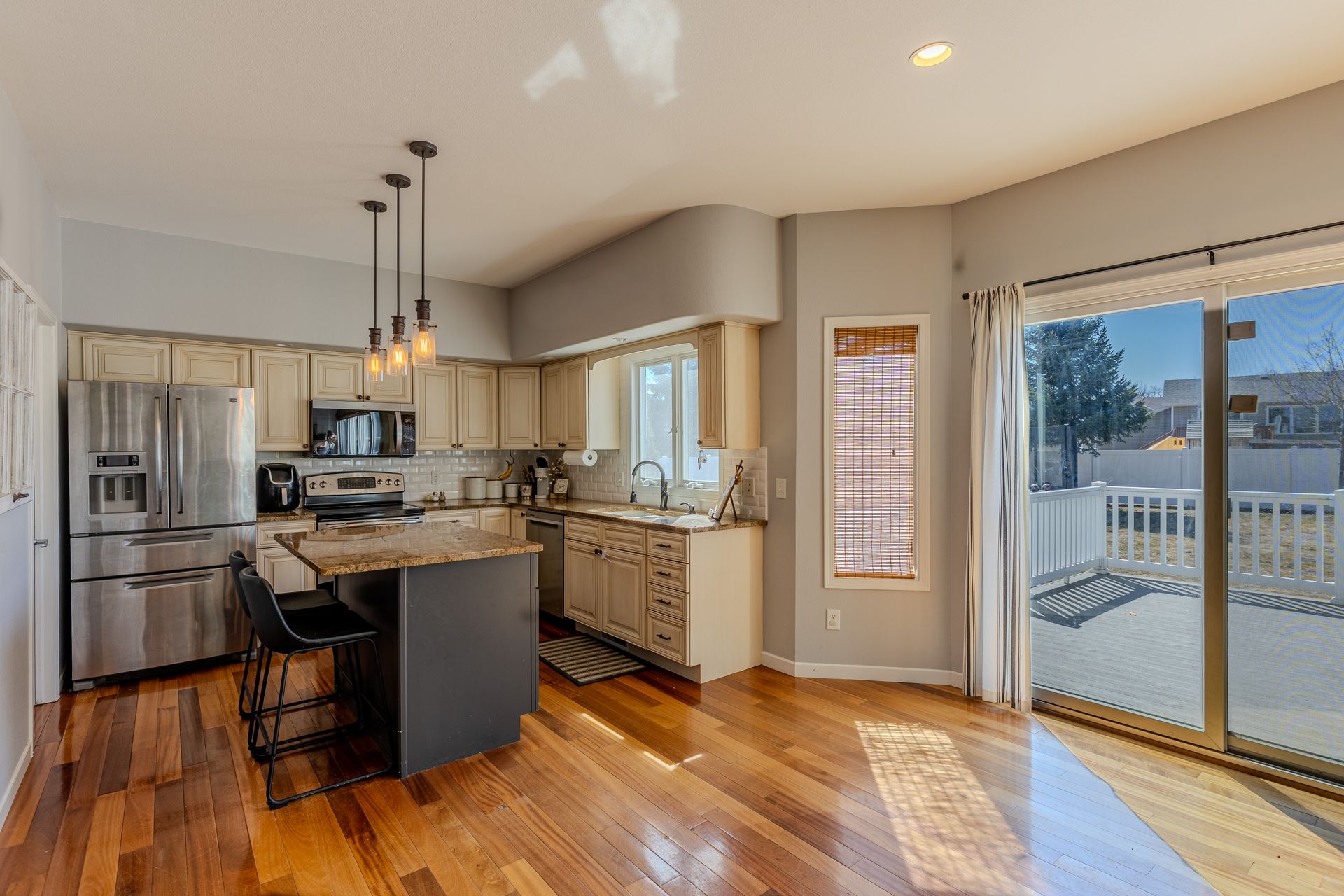Located in Lakewood, this 4 bed, 4 bath home offers great natural light and a large garage with high ceilings. The spacious entry features a custom bench with storage and coat hooks. Main floor includes hardwood floors, a large living room with gas fireplace, dining area, and updated kitchen with granite countertops, glazed antique white cabinets, walk-in pantry, double oven, and access to the maintenance-free deck. Upper level offers 3 bedrooms on one level including a large primary suite with walk-in closet, jetted tub, walk-in shower, and dual sinks. Separate laundry room with sink and storage also on the upper level. Basement includes family room with a second gas fireplace, built-in cabinets, and wet bar. 4th bedroom with egress window, another laundry hookup, and a 3/4 bath with European-style vanity complete the lower level. Recent updates: new paint and fireplace surround (2024), air conditioner (2024), and shingles, gutters, gutter guards, and downspouts (2024). Exterior features a landscaped yard with sprinklers, deck, patio, and vinyl fence with double gate access to backyard. Buyer to verify all information.